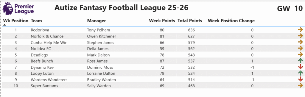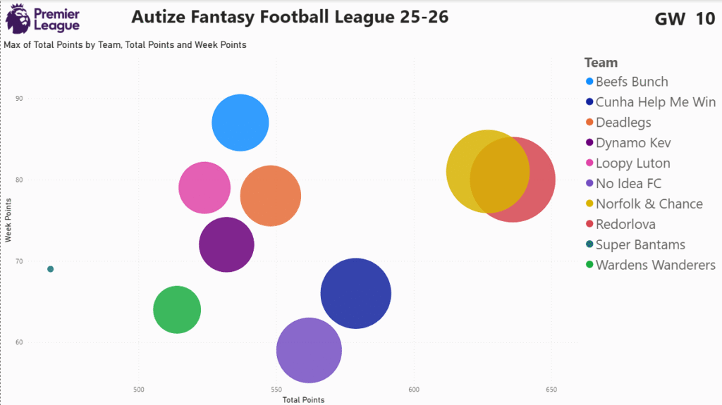 The top two in the league have still got a good gap to the rest of the field, in fact they have extended the gap to third place this week. Sadly Sally appears to be losing ground to the reasonably tightly packed mid table group, not quite an entire weeks points behind the next team but not far off, here’s hoping she reverses the trend next weekend.