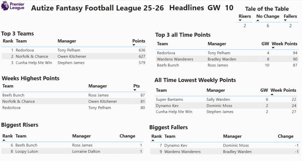 Two up two down and six unchanged for the week, the movement all being in the lower half of the league table. As with last week the Autize league outscored the overall average points scored with 72 versus an overall average of 65, can this trend continue or will a reversion to the mean occur soon?